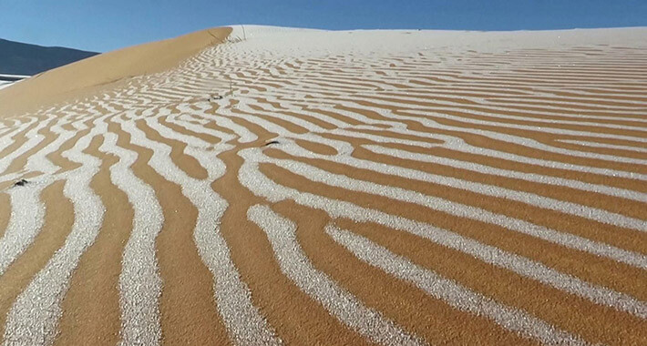 Temperatura je nedavno u pustinji pala na minus tri stepena. Ovakvi događaji su veoma rijetki, a prethodno su zabilježeni 1979., 2016. i 2018. godine.