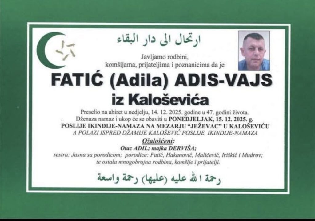 Adis Fatić Vajs preselio je na ahiret u 47. godini života. Dženaza će se obaviti prema objavljenim podacima porodice.