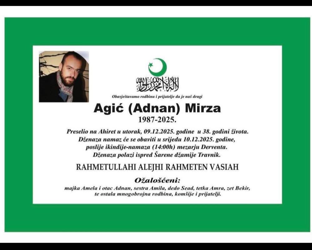 Travnik je potresla vijest o iznenadnoj smrti Mirze Agića (sin Adnana), koji je preselio na Ahiret u utorak, 9. decembra 2025. godine, u 38. godini života, piše 072info.