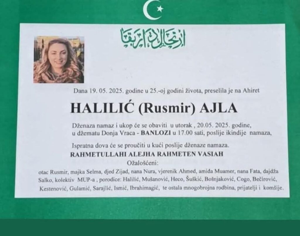 Dženaza-namaz i ukop bit će obavljeni u utorak, 20. maja 2025. godine u džematu Donja Vrca – Banlozi, s početkom u 17:00 sati, poslije ikindije namaza.