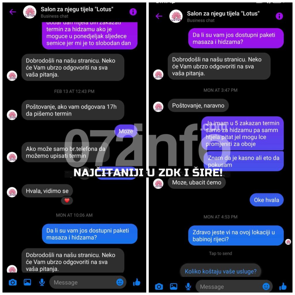 -Zamolila bih vas da objavite moje, nažalost, traumatično iskustvo sa odlaskom u Salon za njegu tijela “Lotus”. Naime, nakon čitanja samo hvale za ovaj salon i po preporuci druga, zakazala sam termin za masažu i hidžamu u ovom salonu za ponedjeljak, 19.02.2024 u 17:00h.
