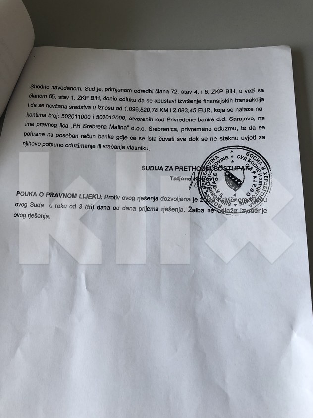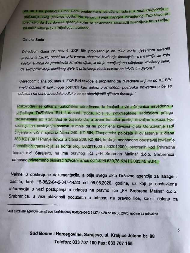 Računi su ekspresno blokirani, a u obrazloženju Sud BiH ocjenjuje da u ovom trenutku postoji dovoljno dokaza koji ukazuju na počinjena krivična djela: Udruživanje radi činjenja krivičnih djela, zlopupotreba položaja ili ovlaštenja i pranje novca. Zbog svega toga izdato je rješenje o blokadi računa “Srebrenoj malini” u izbnosu većem od milion KM.