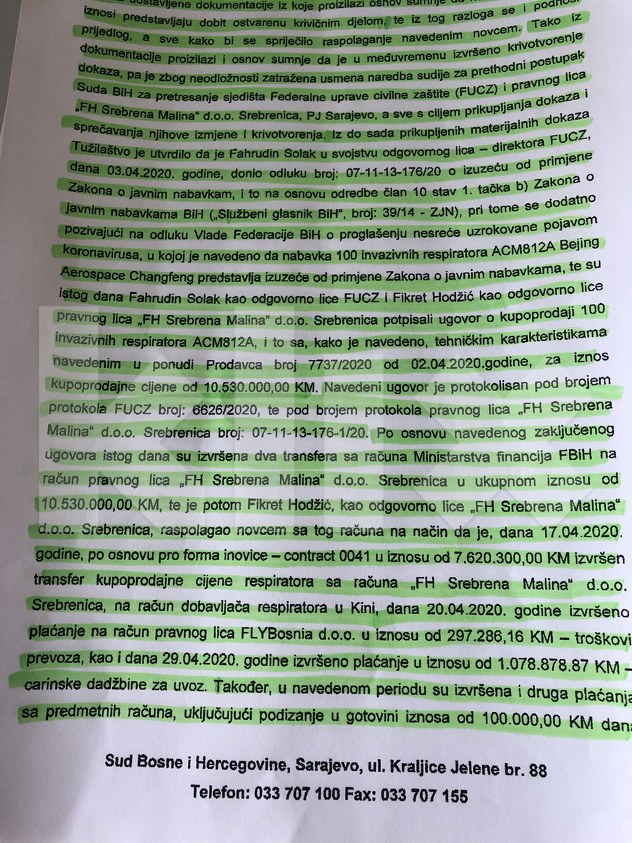 Klix.ba ekskluzivno objavljuje izvještaj Suda BiH koji nedvosmisleno dokazuje da na osnovu prikupljenih dokaza u procesu nabavke 100 respiratora postoji osnov sumnje da je učinjeno više krivičnih djela i to: udruživanje radi činjenja krivičnih djela, zloupotreba položaja ili ovlasti i pranje novca.Radi se o izvještaju Suda BiH na osnovu zahtjeva Tužilaštva BiH da se preduzeću “Srebrena malina” blokiraju računi i obustave finansijske transakcije. Računi su blokirani prošle sedmice, a uz rješenje o blokadi Sud BiH je donio detaljan izvještaj na osnovu informacija dostavljenih iz Tužilaštva BiH i Državne agencije za istrage i zaštitu (SIPA).
