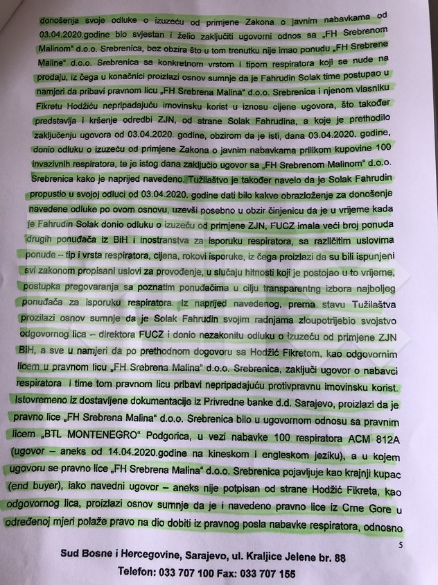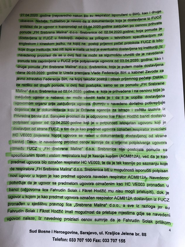 Sud smatra da iz navedenog proizilazi osnov sumnje da u vrijeme potpisivanja ugovora između FUCZ-a i “Srebrene maline” nije postojala ponuda sa specificiranim tipom i vrstom respiratora koji je kasnije kupljen (ACM812A), već je kao predmet ugovora označen respirator HC VE003. Tako postoji osnovana sumnja da je tek kasnije po saznanju koje će respiratore “Srebrena malina” biti u mogućnosti isporučiti, potpisan novi ugovor u kojem je kao predmet ugovora naveden respirator ACM812A.