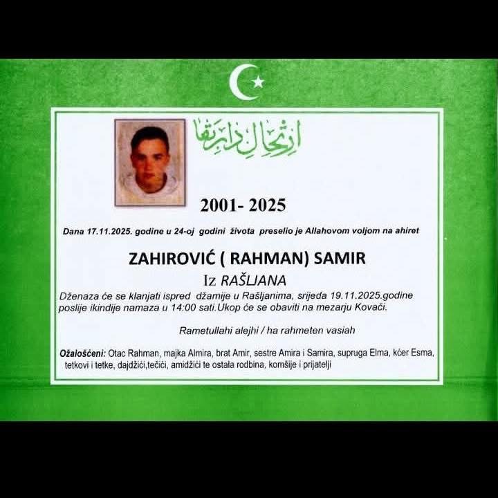 U šumi kod Žepča, dok je radio da prehrani svoju porodicu, poginuo je mladi otac i suprug Samir Zahirović, rođen 2001. godine iz Rašljana kod Brčkog, piše 072info.