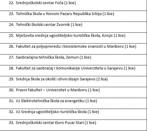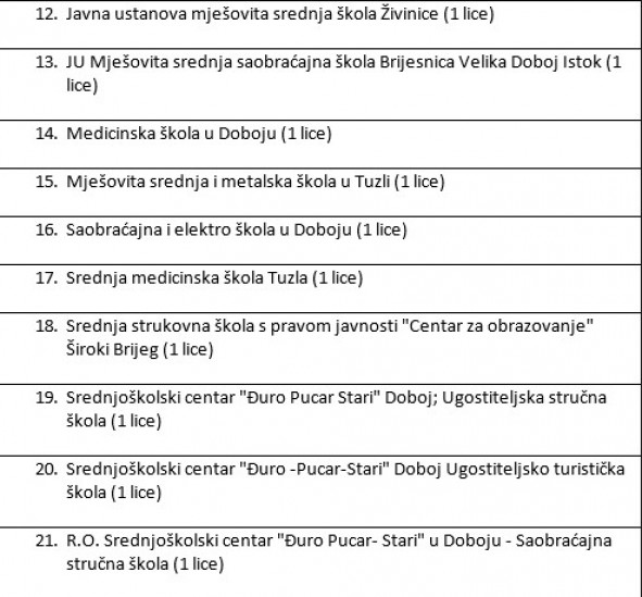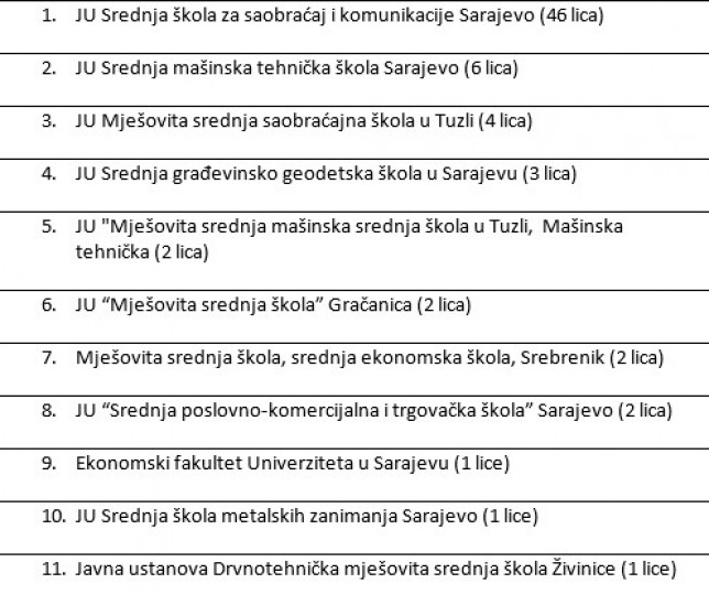 Radi se o osobama koje su prilikom zaposlenja predočile diplome srednjih škola i tri visokoškolske ustanove. Srednja škola za saobraćaj i komunikacije Sarajevo nije mogla potvrditi validnost diplome za čak 46 osoba.