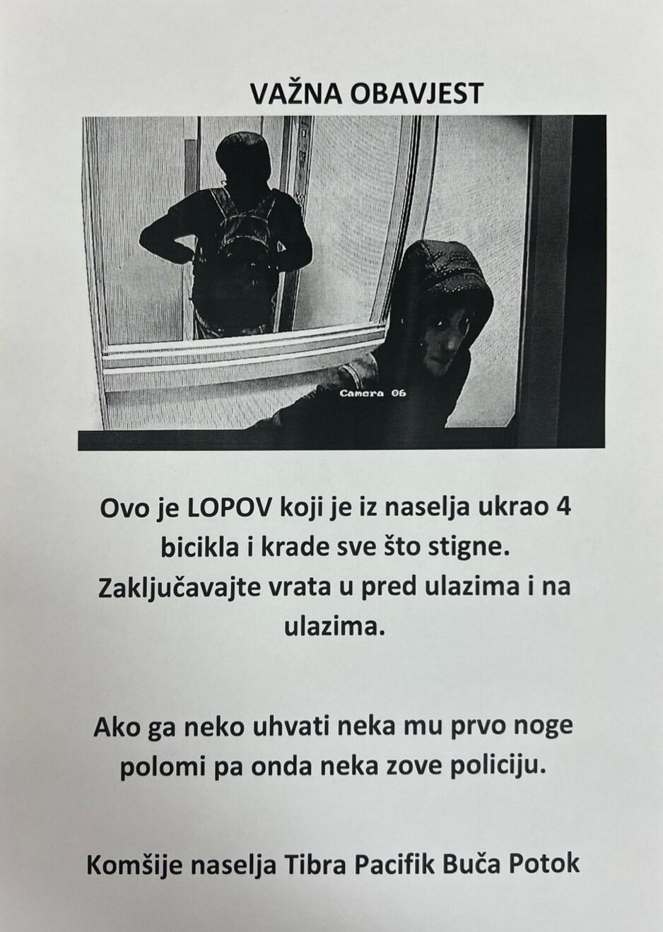 U posljednjih sedam dana građani stanovnici zgrade Tibra u Buća Potoku su prijavili nekoliko pljački, iza kojih po svemu sudeći stoji ista osoba.