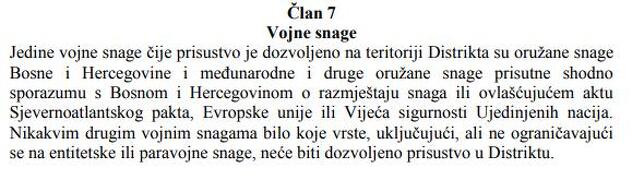 “Jedine vojne snage čije prisustvo je dozvoljeno na teritoriji Distrikta su oružane snage Bosne i Hercegovine i međunarodne i druge oružane snage prisutne shodno sporazumu s Bosnom i Hercegovinom o razmještaju snaga ili ovlašćujućem aktu Sjevernoatlantskog pakta, Evropske unije ili Vijeća sigurnosti Ujedinjenih nacija. Nikakvim drugim vojnim snagama bilo koje vrste, uključujući, ali ne ograničavajući se na entitetske ili paravojne snage, neće biti dozvoljeno prisustvo u Distriktu”.