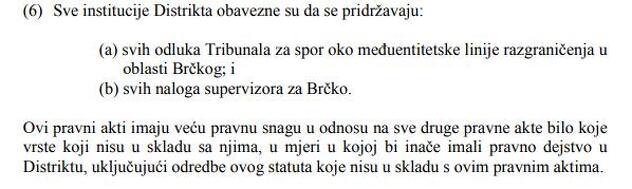 “Ovi pravni akti imaju veću pravnu snagu u odnosu na sve druge pravne akte bilo koje vrste koji nisu u skladu sa njima, u mjeri u kojoj bi inače imali pravno dejstvo u Distriktu, uključujući odredbe ovog statuta koje nisu u skladu s ovim pravnim aktima”, stoji u nastavku člana 1.