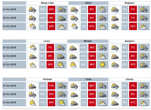 U utorak će u Bosni veći dio dana preovladavati oblačno vrijeme, a u Hercegovini je moguće razvedravanje. Najniža jutarnja temperatura zraka uglavnom između 5 i 9 stepeni, na jugu zemlje od 9 do 14. Najviša dnevna temperatura zraka bit će između 10 i 15 stepeni, jugu zemlje od 18 do 23 stepena.