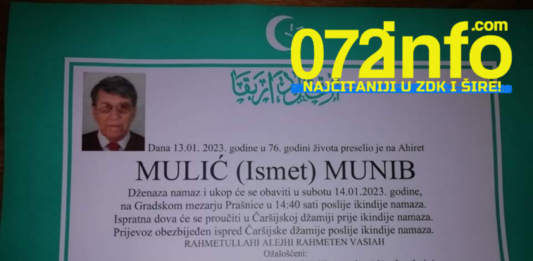 Zenica tuguje nakon vijesti da je jutros u 76. godini života zauvijek prestalo kucati srce velikog čovjeka i ljekara prim.dr Muniba Mulića, specijaliste pedijatar. Mulić je bio hospitaliziran u Kantonalnoj bolnici Zenica, na koronarnom odjelu, a ova vijest potresla je sve one koji su poznavali ovog uvaženog doktora. Svoj radni vijek proveo je radeći u … Nastavi čitati Sutra dženaza prim.dr Muliću: Otišao je kako je i živio – tiho i mirno