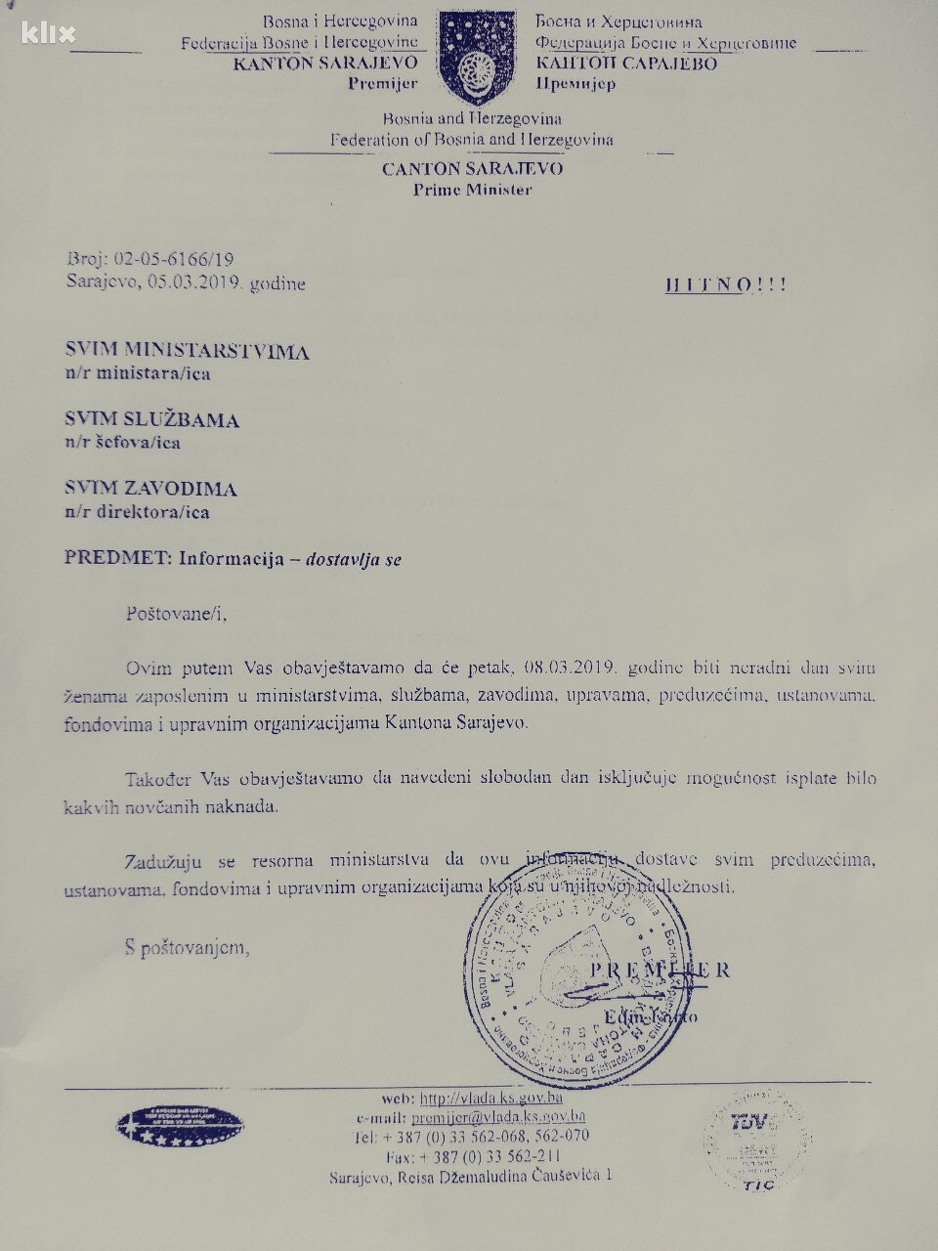 Povodom 8. marta, Međunarodnog dana žena, odlukom premijera Kantona Sarajevo Edina Forte, svim ženama zaposlenim u javnim ustanovama ovog kantona petak će biti neradni dan. “Ovim putem vas obavještavam da će petak, 8. mart, biti neradni dan svim ženama zaposlenim u ministarstvima, službama, zavodima, upravama, preduzećima, ustanovama, fondovima i upravnim organizacijama Kantona Sarajevo. Također vas obavještavamo da navedeni slobodan dan isključuje mogućnost isplate bilo kakvih novčanih naknada”, navodi se između ostalog u premijerovom obavještenju.