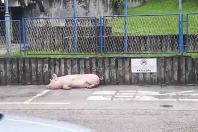 Naime, na društvenim mrežama osvanuo je video na kojem se vidi kako je svinja privezana za ogradu koja se nalazi na parkingu Policijske uprave Mrkonjić Grada.