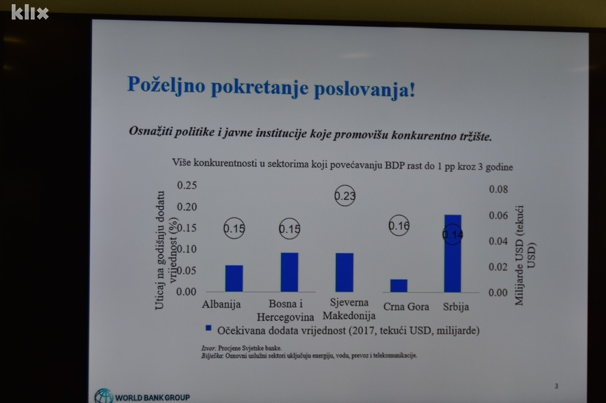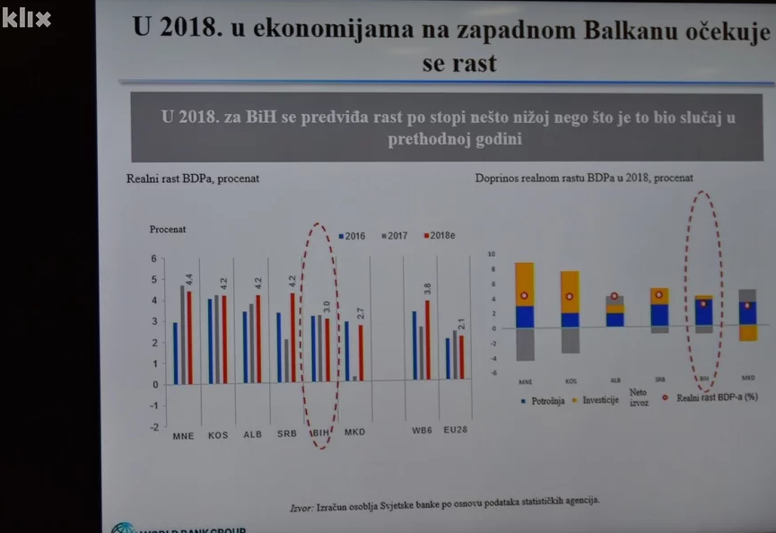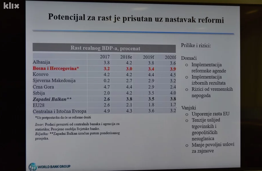 Prema podacima iz posljednjeg Redovnog ekonomskog izvještaja za Zapadni Balkan potrebno je ubrzavanje reformi, dok ekonomski rast na zapadnom Balkanu bilježi ubrzanje sa 2,6 posto u 2017. godini na 3,8 posto u 2018. godini, uz projektovani prosjek od 3,7 posto u periodu 2019.-2020. godine. “Međutim, ovakvi izgledi su podložni rastućim vanjskih i domaćim rizicima, uključujući geopolitičke i trgovinske sporove i sporiji od očekivanog tempa strukturnih reformi. Prema izvještaju, zemlje regiona sada imaju priliku unaprijediti reforme kako bi ublažile ove rizike usljed sve većih zahtijeva javnosti za većim ekonomskim mogućnostima”, saopćeno je iz Svjetske banke.
