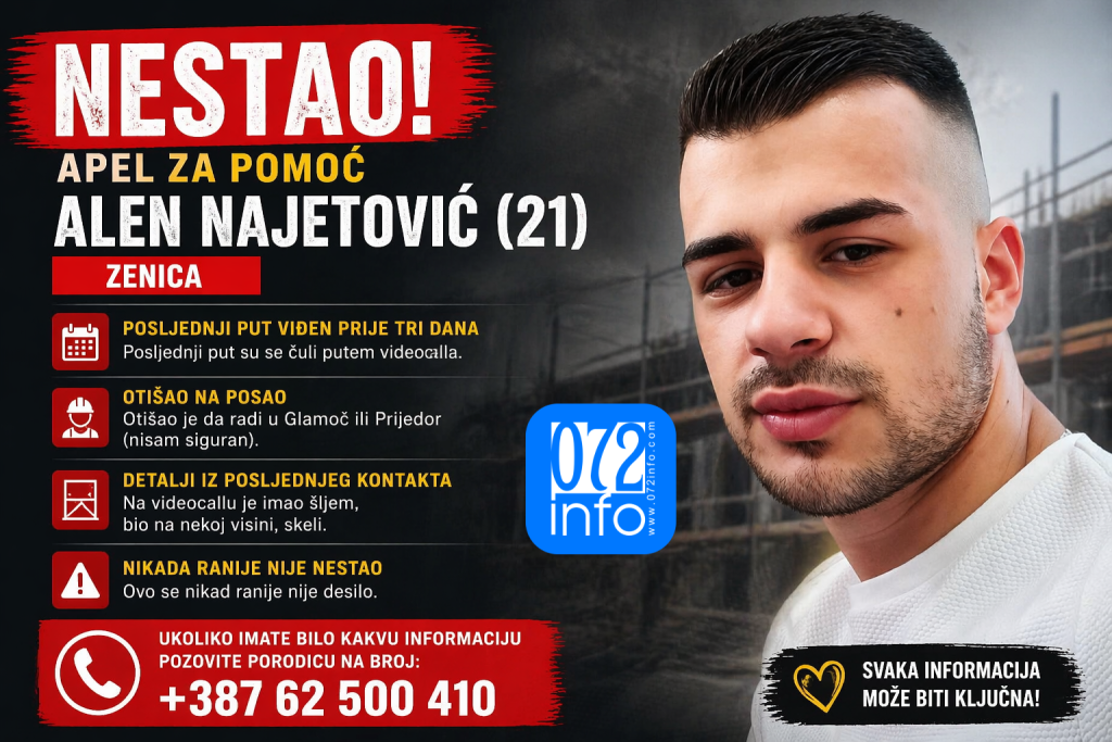 Nakon objave na 072info: Alen Najetović se javio porodici, evo šta se dogodiloNakon što je portal 072info objavio apel porodice Najetović iz Zenice o…21.04. u 22:39 / BiH, VijestiNestao mladić iz Zenice: Porodica Najetović traži pomoć u pronalasku 21-godišnjeg AlenaNa društvenim mrežama širi se apel porodice Najetović iz Zenice, koja traga…21.04. u 21:18 / Vijesti Nakon objave na 072info: Alen Najetović se javio porodici, evo šta se dogodilo21.04. u 22:39 / BiH, VijestiNestao mladić iz Zenice: Porodica Najetović traži pomoć u pronalasku 21-godišnjeg Alena21.04. u 21:18 / Vijesti