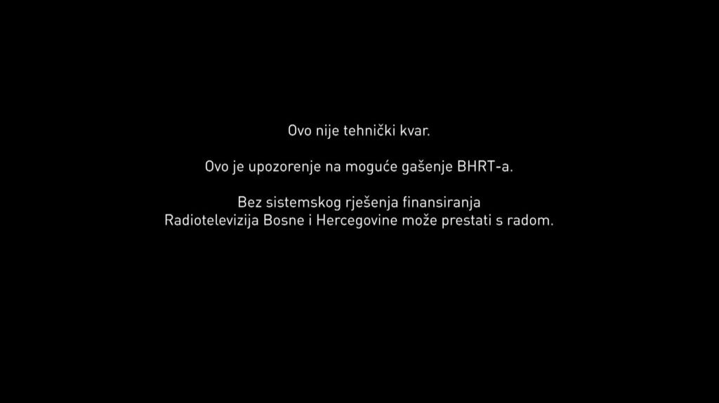 BHRT: Upozoravamo na moguće trajno gašenje vašeg javnog servisaBHRT se i jutros oglasio nakon jučerašnjeg obavještenja javnosti o mogućnosti gašenja…27.02. u 08:50 / BiH, Vijesti BHRT: Upozoravamo na moguće trajno gašenje vašeg javnog servisa27.02. u 08:50 / BiH, Vijesti
