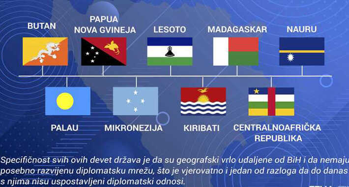 BiH još bez diplomatskih odnosa s osam članica UN-aBosna i Hercegovina je od 1992. godine članica Ujedinjenih nacija, ali do…25.10. u 15:10 / BiH, VijestiOvo su države s kojima BiH još nema uspostavljene diplomatske odnoseStalni predstavnik Bosne i Hercegovine pri Ujedinjenim narodima ambasador Sven Alkalaj potpisao…14.02. u 17:30 / BiH, Vijesti BiH još bez diplomatskih odnosa s osam članica UN-a25.10. u 15:10 / BiH, VijestiOvo su države s kojima BiH još nema uspostavljene diplomatske odnose14.02. u 17:30 / BiH, Vijesti