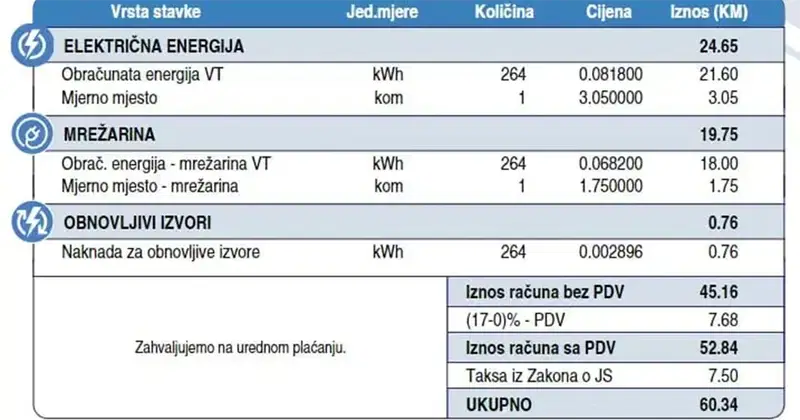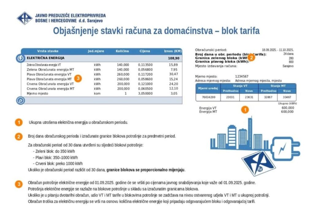 Novi ugovor privremeno spašava naplatu RTV takse kroz račune za strujuNakon višemjesečnih zastoja i tenzija, BHRT, FTV i Elektroprivreda Bosne i Hercegovine…01.12. u 14:33 / BiH, VijestiElektroprivredi BiH se crno piše: Gubitak na kraju godine se procjenjuje na skoro 65 miliona KMZa državnu kompaniju Elektroprivredu BiH kraj 2025.godine finansijski će biti ponovo nepovoljan.…16.11. u 17:59 / BiH, VijestiPotpuni preokret u Elektroprivredi BiH: Umjesto planirane dobiti, očekuje se ogroman gubitakElektroprivreda BiH (EPBiH) ove godine, prema posljednjim analizama, očekuje gubitak iz poslovanja…29.10. u 10:01 / BiH, VijestiZa opstanak termoelektrana do 2050. godine potrebno pola milijarde KMTermoelektrane u Tuzli i Kaknju, izgrađene još šezdesetih i sedamdesetih godina, i…26.10. u 14:25 / BiH, VijestiOd danas na snazi zimska tarifa, evo u koje vrijeme će struja biti jeftinaNedjeljom će biti cijeli dan Prelaskom na zimsko računanje vremena od nedjelje,…26.10. u 10:26 / BiH, VijestiElektroprivreda BiH moli građane da troše manje strujeU vremenu u kojem svjetska populacija sve intenzivnije promišlja i upozorava na…10.10. u 11:41 / BiH, VijestiTelekomi i elektroprivrede opet drže prvu poziciju po najvišim prosječnim plaćamaU posljednje četiri godine, neto plaća u Federaciji BiH se prosječno godišnje…29.09. u 20:16 / BiH, VijestiElektroprivreda BiH pojasnila blok tarife: Evo kako se formiraju računi za domaćinstvaJavno preduzeće Elektroprivreda Bosne i Hercegovine d.d. Sarajevo objavilo je detaljno pojašnjenje…16.09. u 10:28 / BiH, VijestiOvako će izgledati novi računi za struju. Tu je i računica koliki bi vam iznosi mogli doći na naplatuZa korisnike Elektroprivrede Bosne i Hercegovine od 1. septembra poskupila je električna…03.09. u 09:06 / BiH, VijestiOd ponedjeljka nove cijene struje: Građanima upućen važan poziv za očitanje brojilaOd ponedjeljka, 1. septembra 2025. godine, domaćinstvima će se obračunavati potrošnja električne…28.08. u 13:25 / BiH, Vijesti Novi ugovor privremeno spašava naplatu RTV takse kroz račune za struju01.12. u 14:33 / BiH, VijestiElektroprivredi BiH se crno piše: Gubitak na kraju godine se procjenjuje na skoro 65 miliona KM16.11. u 17:59 / BiH, VijestiPotpuni preokret u Elektroprivredi BiH: Umjesto planirane dobiti, očekuje se ogroman gubitak29.10. u 10:01 / BiH, VijestiZa opstanak termoelektrana do 2050. godine potrebno pola milijarde KM26.10. u 14:25 / BiH, VijestiOd danas na snazi zimska tarifa, evo u koje vrijeme će struja biti jeftina26.10. u 10:26 / BiH, VijestiElektroprivreda BiH moli građane da troše manje struje10.10. u 11:41 / BiH, VijestiTelekomi i elektroprivrede opet drže prvu poziciju po najvišim prosječnim plaćama29.09. u 20:16 / BiH, VijestiElektroprivreda BiH pojasnila blok tarife: Evo kako se formiraju računi za domaćinstva16.09. u 10:28 / BiH, VijestiOvako će izgledati novi računi za struju. Tu je i računica koliki bi vam iznosi mogli doći na naplatu03.09. u 09:06 / BiH, VijestiOd ponedjeljka nove cijene struje: Građanima upućen važan poziv za očitanje brojila28.08. u 13:25 / BiH, Vijesti