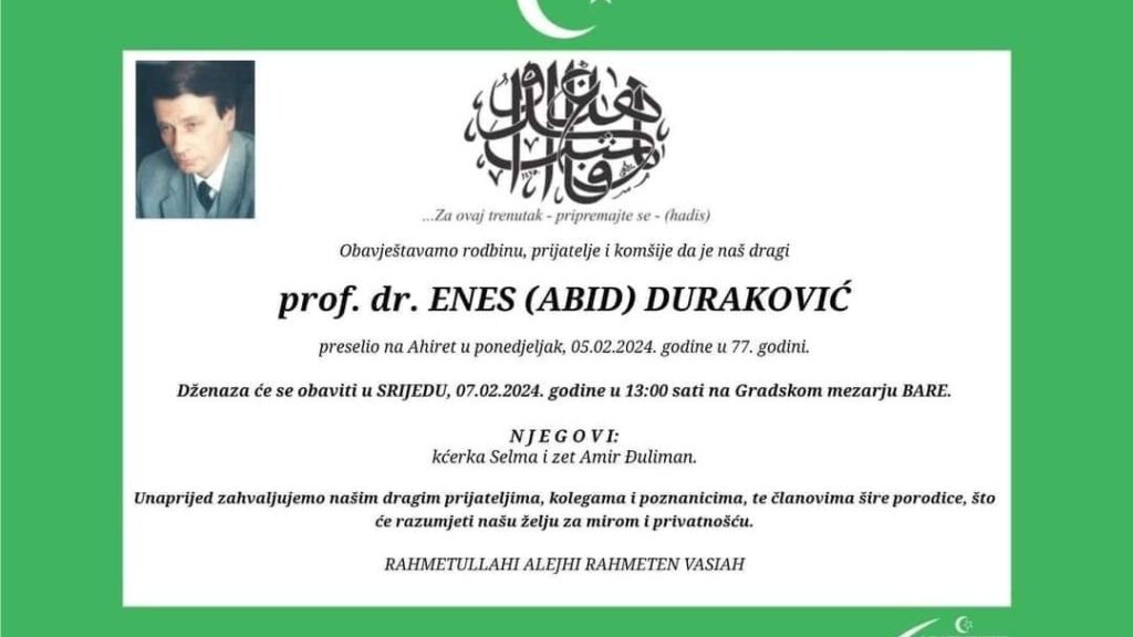 Poznat termin dženaze jednom od najznačajnijih historičara bh. književnosti Enesu DurakovićuDženaza jednom od najznačajnijih historičara bošnjačke i bh. književnosti Enesu Durakoviću klanjat…06.02. u 09:00 / BiH, VijestiPreminuo historičar književnosti Enes DurakovićJedan od najznačajnijih historičara bošnjačke i bh. književnosti Enes Duraković preminuo je…05.02. u 21:14 / BiH, Vijesti Poznat termin dženaze jednom od najznačajnijih historičara bh. književnosti Enesu Durakoviću06.02. u 09:00 / BiH, VijestiPreminuo historičar književnosti Enes Duraković05.02. u 21:14 / BiH, Vijesti