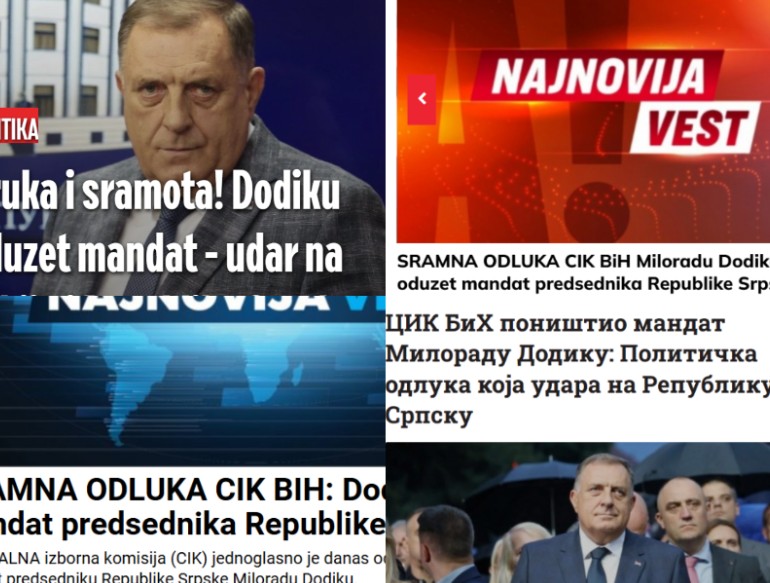 Vraća se Al Jazeera Balkans?Mreža Al Jazeera Media imenovala je iskusnog novinara Jamala Elshayala za direktora…11.11. u 09:41 / BiH, VijestiKosovski CIK uskratio srpskim medijima praćenje lokalnih izboraCentralna izborna komisija Kosova (CIK) nakon sjednice održane jučer objavila je listu…10.10. u 14:15 / Regija, VijestiMarta Kos u Sarajevu: EU izdvaja sedam miliona eura za medije i civilno društvo u BiHEvropska komesarka za proširenje Marta Kos najavila je finansijsku podršku Europske unije…23.09. u 13:35 / BiH, VijestiSebija Izetbegović: Mediji šute o kolapsu KCUS-a, ali ne i o meniBivša direktorica Kliničkog centra Univerziteta u Sarajevu (KCUS) Sebija Izetbegović oglasila se…12.09. u 16:18 / BiH, VijestiBahatost Vučićevih medija nakon odluke CIK-a: Tvrde da je sve dio specijalnog rata protiv Srbije i RSProrežimski mediji u Srbiji, kako se i očekivalo, brutalnim su komentarima ispratili…06.08. u 18:22 / Regija, VijestiGrađani BiH najviše vjeruju medijima, najmanje političarimaGrađani BiH trenutno najviše vjeruju medijima, a najmanje političarima. To je pokazalo…05.05. u 00:22 / BiH, VijestiIndeks medijskih sloboda u svijetu: BiH na 86. mjestu na listi od 180 zemaljaBiH je nazadovala za pet mjesta na Svjetskom indeksu medijskih sloboda i…03.05. u 09:55 / BiH, VijestiDodik za austrijski medij izjavio kako “muslimani u BiH žele rat” i da bi ga Putin spasio ukoliko bude potrebnoPredsjednik RS Milorad Dodik dao je intervju za austrijski medij "Profil" u…01.05. u 19:49 / BiH, VijestiDodik odbacuje optužbe: Sarajevski mediji spinuju, ja sam slobodan i borim se za RSPredsjednik Republike Srpske Milorad Dodik izjavio je da će nastaviti živjeti u…28.03. u 20:37 / BiH, VijestiDodik: Mediji lažu i petljaju, ne bježim od pravde, u Sarajevu se napravila atmosfera linča i hapšenjaU Sarajevu su napravili atmosferu linča i hapšenja, dok funkcioneri iz Federacije…10.03. u 18:42 / BiH, Vijesti Vraća se Al Jazeera Balkans?11.11. u 09:41 / BiH, VijestiKosovski CIK uskratio srpskim medijima praćenje lokalnih izbora10.10. u 14:15 / Regija, VijestiMarta Kos u Sarajevu: EU izdvaja sedam miliona eura za medije i civilno društvo u BiH23.09. u 13:35 / BiH, VijestiSebija Izetbegović: Mediji šute o kolapsu KCUS-a, ali ne i o meni12.09. u 16:18 / BiH, VijestiBahatost Vučićevih medija nakon odluke CIK-a: Tvrde da je sve dio specijalnog rata protiv Srbije i RS06.08. u 18:22 / Regija, VijestiGrađani BiH najviše vjeruju medijima, najmanje političarima05.05. u 00:22 / BiH, VijestiIndeks medijskih sloboda u svijetu: BiH na 86. mjestu na listi od 180 zemalja03.05. u 09:55 / BiH, VijestiDodik za austrijski medij izjavio kako “muslimani u BiH žele rat” i da bi ga Putin spasio ukoliko bude potrebno01.05. u 19:49 / BiH, VijestiDodik odbacuje optužbe: Sarajevski mediji spinuju, ja sam slobodan i borim se za RS28.03. u 20:37 / BiH, VijestiDodik: Mediji lažu i petljaju, ne bježim od pravde, u Sarajevu se napravila atmosfera linča i hapšenja10.03. u 18:42 / BiH, Vijesti