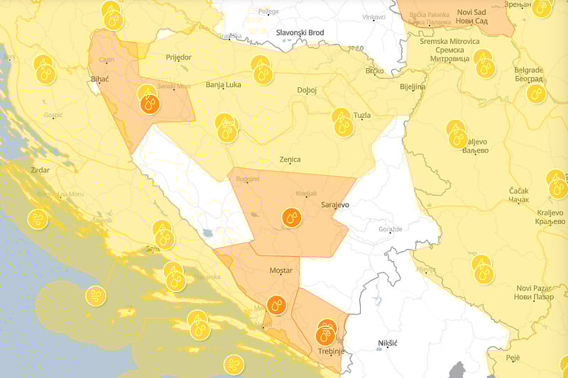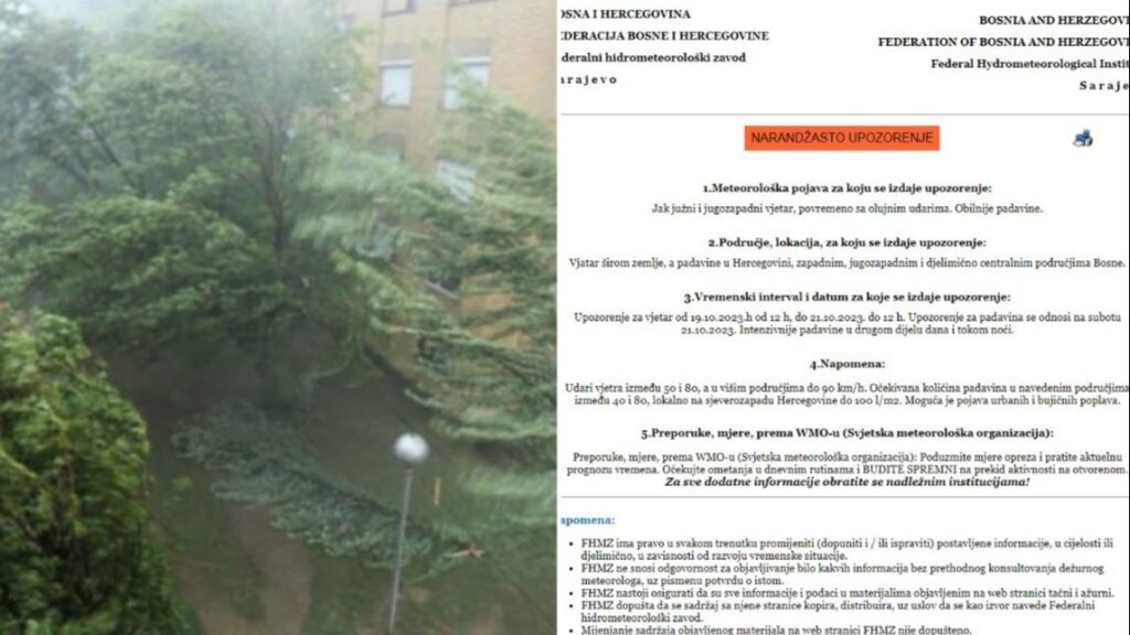 U toku noći nove obilne padavine: Upaljen narandžasti meteoalarmU Bosni i Hercegovini danas veći dio dana preovladavat će sunčano uz…08.10. u 07:14 / BiH, VijestiZa poplavljena područja izdat novi narandžasti meteoalarmIzdato je narandžasto upozorenje za jaču kišu na zapadu, istoku i sjeveru…07.10. u 12:06 / BiH, VijestiNa snazi narandžasti meteoalarm zbog jakih udara vjetraU Bosni i Hercegovini danas će preovladavati umjereno do pretežno oblačno vrijeme.…27.03. u 07:05 / BiH, VijestiSavjet klimatologa: Ne ostavljajte automobile u blizini starih stabala koje vjetar može iščupatiUpaljen je narandžast meteoalarm zbog obilnih padavina i vjetra južnog smjera. Upozorenje…10.02. u 22:25 / BiH, VijestiUpaljen narandžasti meteoalarm: Upozorenje na jake i olujne udare vjetraU našoj zemlji danas se očekuje umjereno do pretežno oblačno i vjetrovito…20.10. u 08:15 / BiH, VijestiNarandžasti meteo alarm za BiH: Očekuje se jak vjetar i obilne padavineFederalni hidrometeorološki zavod izdao je narandžasto upozorenje za BiH zbog očekivanog jakog…19.10. u 11:20 / BiH, VijestiNarandžasti meteoalarm u BiH: Obilne padavine i jaki udari vjetra, izdato upozorenje za poplaveFederalni hidrometeorološki zavod izdao je narandžasto upozorenje za sutra zbog obilnih padavina…13.05. u 18:30 / BiH, VijestiUPOZORENJE SKIJAŠIMA: Vjetar dostiže jačinu i do 133 km/hNa području cijele BiH upaljen je narandžasti meteoalarm zbog vjetra olujne jačine…04.02. u 11:45 / BiH, VijestiVAŽNO UPOZORENJE: Upaljen narandžasti meteoalarm zbog olujnih udara vjetraDanas u Bosni i Hercegovini oblačno vrijeme sa kišom. Jače padavine na…22.11. u 07:55 / BiH, VijestiIzdato narandžasto upozorenjeFederalni hidrometeorološki zavod izdao je narandžasto upozorenje za područje Hercegovine i jugozapadne…25.09. u 14:50 / BiH, Vijesti U toku noći nove obilne padavine: Upaljen narandžasti meteoalarm08.10. u 07:14 / BiH, VijestiZa poplavljena područja izdat novi narandžasti meteoalarm07.10. u 12:06 / BiH, VijestiNa snazi narandžasti meteoalarm zbog jakih udara vjetra27.03. u 07:05 / BiH, VijestiSavjet klimatologa: Ne ostavljajte automobile u blizini starih stabala koje vjetar može iščupati10.02. u 22:25 / BiH, VijestiUpaljen narandžasti meteoalarm: Upozorenje na jake i olujne udare vjetra20.10. u 08:15 / BiH, VijestiNarandžasti meteo alarm za BiH: Očekuje se jak vjetar i obilne padavine19.10. u 11:20 / BiH, VijestiNarandžasti meteoalarm u BiH: Obilne padavine i jaki udari vjetra, izdato upozorenje za poplave13.05. u 18:30 / BiH, VijestiUPOZORENJE SKIJAŠIMA: Vjetar dostiže jačinu i do 133 km/h04.02. u 11:45 / BiH, VijestiVAŽNO UPOZORENJE: Upaljen narandžasti meteoalarm zbog olujnih udara vjetra22.11. u 07:55 / BiH, VijestiIzdato narandžasto upozorenje25.09. u 14:50 / BiH, Vijesti