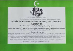 Muderris povodom trogodišnjice preseljenja kćerke Nudžejme: Sanjamo te svi…U nedjelju se navršilo tri godine od preseljenja na Ahiret Nudžejme Halilović…29.11. u 07:00 / BiH, VijestiNezim Halilović emotivnim riječima sjetio se kćerke Nudžejme: “Hamza te puno spominje i miriše tvoje mahrame…”Danas, 25.11. navršavaju se dvije godine otkako je na ahiret preselila Nudžejma…25.11. u 11:20 / BiH, VijestiPOTRESAN STATUS NEZIMA HALILOVIĆA MUDERRISA NA GODIŠNJICU SMRTI KĆERKE: Tvoj sin Hamza te puno spominje, sanja te, miriše tvoje haljinePrije nekoliko dana navršila se godina od prerane smrti Nudžejme Halilović-Voloder, kćerke…01.12. u 21:46 / BiH, Izdvojeno, VijestiDANAS JE 26 GODINA OD ROĐENJA NUDŽEJME HALILOVIĆ-VOLODER: Imam i komadant muderris svojom objavom rasplakao mnogeNudžejma Halilović-Voloder, 25-godišnja kćerka Nezima Halilovića Muderrisa, donedavnog rukovodioca Ureda za hadž…09.02. u 13:55 / BiH, VijestiDanas dženaza trudnici koja je preminula u 25. godini životaNudžejma Halilović Voloder jučer je u 10. sedmici trudnoće umrla u svojoj…26.11. u 08:10 / BiH, Vijesti Muderris povodom trogodišnjice preseljenja kćerke Nudžejme: Sanjamo te svi…29.11. u 07:00 / BiH, VijestiNezim Halilović emotivnim riječima sjetio se kćerke Nudžejme: “Hamza te puno spominje i miriše tvoje mahrame…”25.11. u 11:20 / BiH, VijestiPOTRESAN STATUS NEZIMA HALILOVIĆA MUDERRISA NA GODIŠNJICU SMRTI KĆERKE: Tvoj sin Hamza te puno spominje, sanja te, miriše tvoje haljine01.12. u 21:46 / BiH, Izdvojeno, VijestiDANAS JE 26 GODINA OD ROĐENJA NUDŽEJME HALILOVIĆ-VOLODER: Imam i komadant muderris svojom objavom rasplakao mnoge09.02. u 13:55 / BiH, VijestiDanas dženaza trudnici koja je preminula u 25. godini života26.11. u 08:10 / BiH, Vijesti