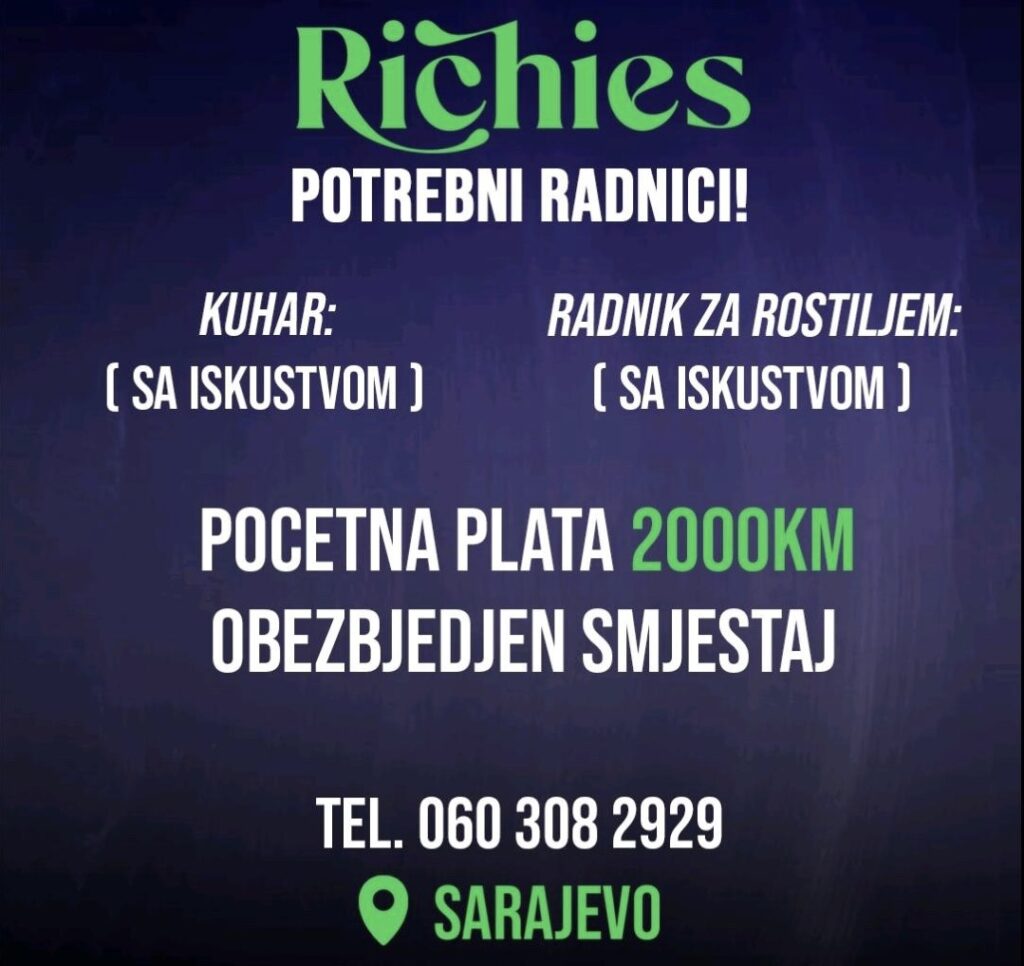 Firmi Richies potrebni radnici u Sarajevu, plaća do 3.000 KM!Firmi Richies potrebni radnici i to: radnici za roštiljem (2 izvršioca), pomoćni…15.04. u 23:10 / Oglasi i konkursi Firmi Richies potrebni radnici u Sarajevu, plaća do 3.000 KM!15.04. u 23:10 / Oglasi i konkursi