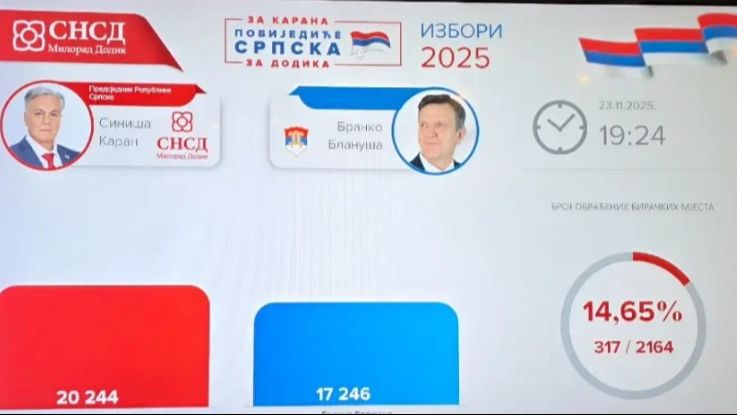 Trivić tvrdi: Blanuša će pobijediti nakon ponovnog brojanjaPredsjednica Narodnog fronta Jelena Trivić, izjavila je da otvaranje vreća na samo…04.12. u 19:03 / BiH, VijestiPenzioneri iz RS koji žive u inozemstvu do kraja godine moraju poslati potvrdu da su živiFond za PIO/MIO Republike Srpske pozvao je sve korisnike koji žive izvan…03.12. u 18:54 / BiH, VijestiVulić o porukama Sabine Ćudić: “Nemoj izazivati ono što ne možeš ispratiti”Reakcije na izjavu Sabine Ćudić, koja je poručila da SNSD “građanima otima…03.12. u 13:32 / BiH, VijestiRekordna potrošnja u RS: Građani za “crni petak” ostavili skoro 228 miliona KMBrojni trgovački centri širom Republike Srpske bili su prepuni i ove godine…02.12. u 14:37 / BiH, VijestiCIK BiH naložio novo brojanje: Prijevremeni izbori za predsjednika RS-a pod dodatnom kontrolomCentralna izborna komisija Bosne i Hercegovine održala je jučer sjednicu na kojoj…02.12. u 13:31 / BiH, VijestiNa izborima u RS glasali i mrtvi, jedna osoba na više listića za KaranaSrpska demokratska stranka (SDS) utvrdila je da su na proteklim izborima glasovali…27.11. u 18:23 / BiH, VijestiBabalj objavio videosnimak: Ukradeno je najmanje 30.000 glasovaPoslanik SDS-a u Predstavničkom domu Parlamentarne skupštine BiH Darko Babalj objavio je…25.11. u 17:12 / BiH, VijestiDodik ponovo prijeti zbog Dana državnosti: Šta god urade u RS, smatraćemo provokacijomDok se širom Bosne i Hercegovine obilježava 25. novembar, dan koji simbolizira…25.11. u 16:20 / BiH, VijestiCIK objavio: Karan 200.116 glasova, Blanuša 188.010Građani bh. entiteta RS danas su glasali na prijevremenim izborima za entitetskog…23.11. u 23:20 / BiH, VijestiObjavljeni rezultati nakon 14 posto prebrojanih biračkih mjesta: Karan ima 3.000 glasova više od BlanušeIz štaba Saveza nezavisnih socijaldemokrata objavljen je novi presjek rezultata za predsjednika…23.11. u 19:47 / BiH, Vijesti Trivić tvrdi: Blanuša će pobijediti nakon ponovnog brojanja04.12. u 19:03 / BiH, VijestiPenzioneri iz RS koji žive u inozemstvu do kraja godine moraju poslati potvrdu da su živi03.12. u 18:54 / BiH, VijestiVulić o porukama Sabine Ćudić: “Nemoj izazivati ono što ne možeš ispratiti”03.12. u 13:32 / BiH, VijestiRekordna potrošnja u RS: Građani za “crni petak” ostavili skoro 228 miliona KM02.12. u 14:37 / BiH, VijestiCIK BiH naložio novo brojanje: Prijevremeni izbori za predsjednika RS-a pod dodatnom kontrolom02.12. u 13:31 / BiH, VijestiNa izborima u RS glasali i mrtvi, jedna osoba na više listića za Karana27.11. u 18:23 / BiH, VijestiBabalj objavio videosnimak: Ukradeno je najmanje 30.000 glasova25.11. u 17:12 / BiH, VijestiDodik ponovo prijeti zbog Dana državnosti: Šta god urade u RS, smatraćemo provokacijom25.11. u 16:20 / BiH, VijestiCIK objavio: Karan 200.116 glasova, Blanuša 188.01023.11. u 23:20 / BiH, VijestiObjavljeni rezultati nakon 14 posto prebrojanih biračkih mjesta: Karan ima 3.000 glasova više od Blanuše23.11. u 19:47 / BiH, Vijesti