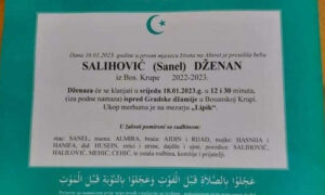 TUGA U BIH: Preminula jednomjesečna bebaBosanska Krupa okovana je tugom nakon vijesti da je preminuo jednomjesečni Dženan…17.01. u 07:55 / BiH, Vijesti TUGA U BIH: Preminula jednomjesečna beba17.01. u 07:55 / BiH, Vijesti