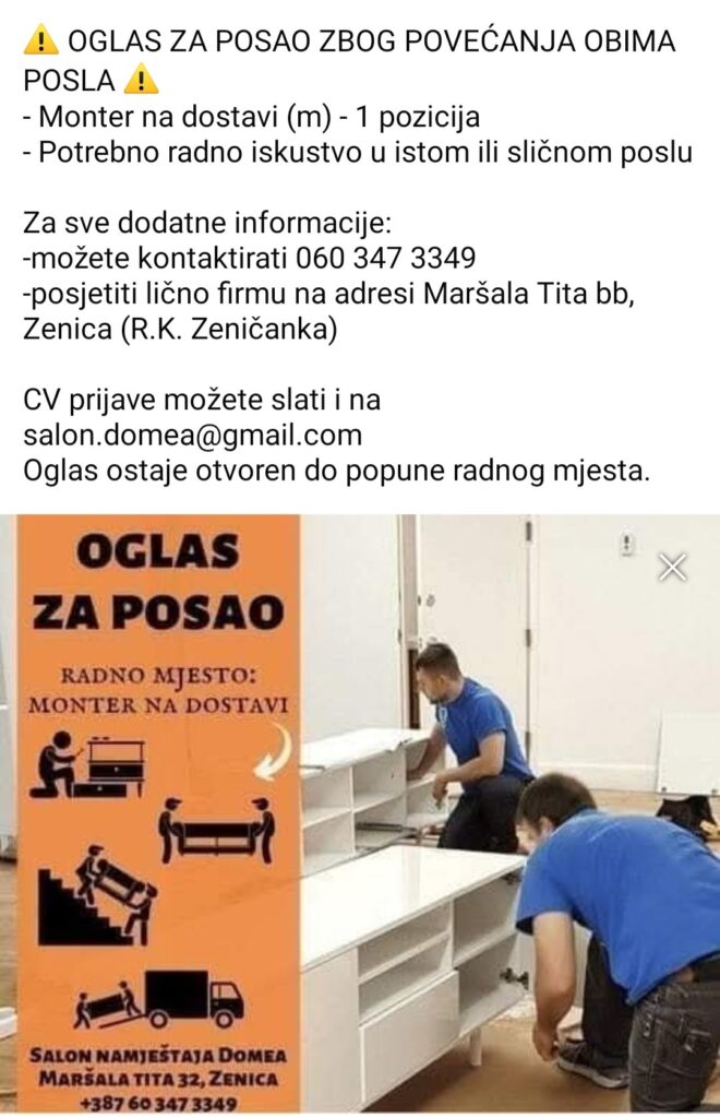 OGLAS ZA POSAO – Potreban MONTER NA DOSTAVI u Salonu namještaja DomeaZbog povećanja obima posla, Salon namještaja Domea iz Zenice zapošljava: 👉 Montera…16.07. u 15:25 / Oglasi i konkursi OGLAS ZA POSAO – Potreban MONTER NA DOSTAVI u Salonu namještaja Domea16.07. u 15:25 / Oglasi i konkursi