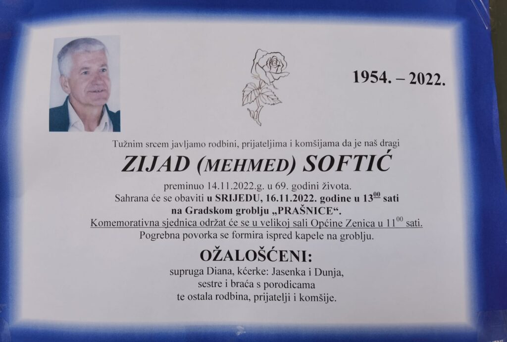 Zenica: Sutra komemoracija i sahrana Zijadu SoftićuZenica tuguje nakon vijesti da je jučer, u 69. godini života, preminuo…15.11. u 12:38 / BiH, VijestiZenica tuguje: Zauvijek nas je napustio Zijad SoftićZenica tuguje nakon vijesti da je jutros preminuo Zijad Softić, dugogodišnji društveni…14.11. u 15:40 / BiH, Vijesti Zenica: Sutra komemoracija i sahrana Zijadu Softiću15.11. u 12:38 / BiH, VijestiZenica tuguje: Zauvijek nas je napustio Zijad Softić14.11. u 15:40 / BiH, Vijesti