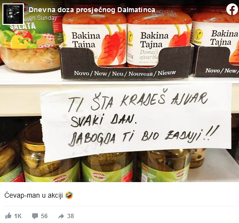 Na Facebook stranici Dnevna doza prosječnog Dalmatinca objavljena je fotografiju iz trgovine u kojoj imaju problema s kradljivcem ajvara. Na polici radnje pojavila se poruka: “Ti što kradeš ajvar svaki dan. Da Bog da ti bio zadnji”.