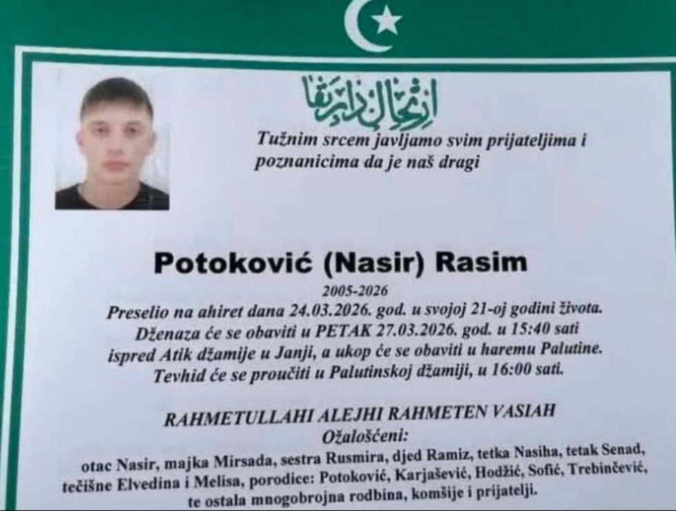 Rasim Potoković (21) preminuo je nakon nesreće koja se dogodila 22.03.2026. godine u Janji, kao suvozač u automobilu. „Avaz“ je u posjedu snimka koji je vrlo uznemirujući, a o ovoj nesreći malo se u javnosti zna.