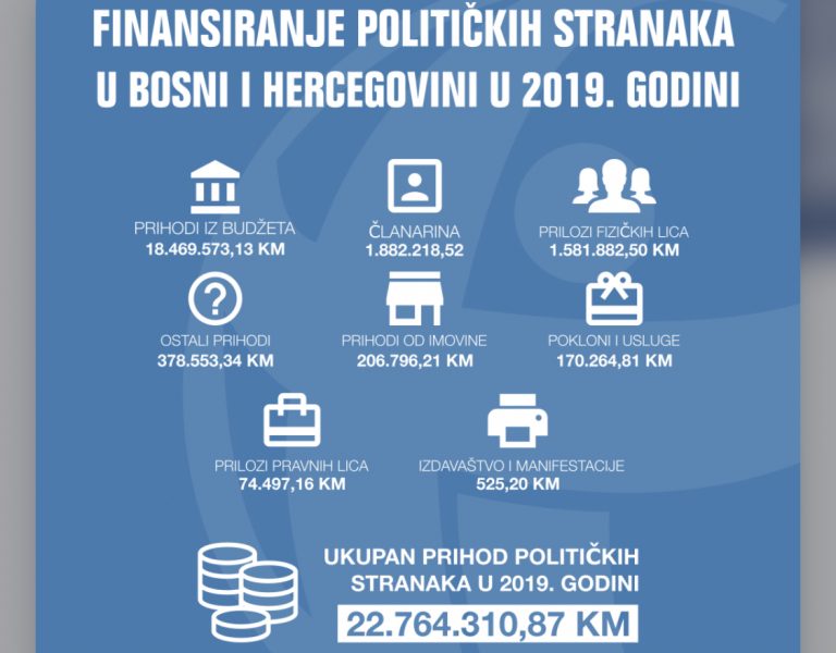 Centralna izborna komisija objavila je finansijske izvještaje političkih stranaka za 2019. godinu, iz kojih je vidljivo da su svi nivoi vlasti u BIH tokom prošle godine izdvojili iz budžeta oko 18 miliona i 400 hiljada maraka za finansiranje političkih stranaka, a od tog iznosa polovinu je dobilo pet najvećih partija (SDA, SNSD, HDZ, SDP i SDS).