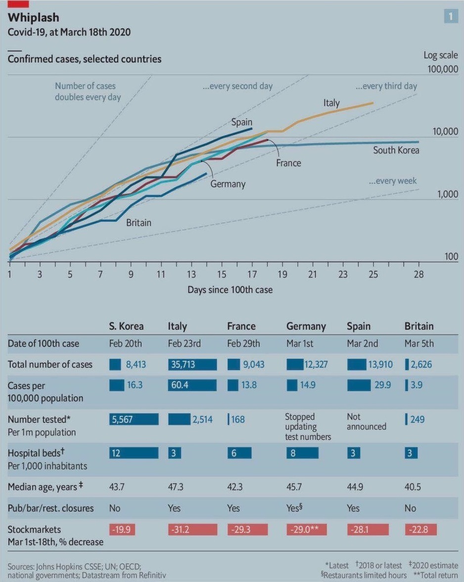 U Italiji je naprimjer, prema pisanju Economista, 23. februara 2019. potvrđen 100. slučaj zaraze koronavirusom, da bi 18. marta 2019. godine bilo 35.713 zaraženih. U Njemačkoj je 1. marta potvrđen 100. slučaj, da bi 18. marta imali 12.327 slučajeva zaraženih virusom COVID-19.