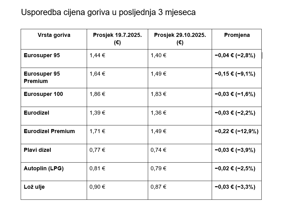 Najveći pad zabilježen je kod premium goriva. Eurosuper 95 Premium je u tri mjeseca pojeftinio za 15 centi, dok je Eurodizel Premium s prosječnih 1,71 € pao na 1,49 € po litri – čak 13 posto manje. To upućuje na pojačanu tržišnu utakmicu među vodećim distributerima poput Ine, Lukoila, Petrola, Shella i Tifona.