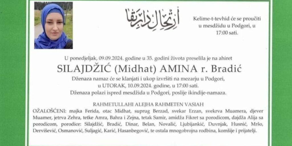 U ponedjeljak, 09.09.2024. godine, u 35. godini života preselila je na ahiret SILAJDŽIĆ (Midhat) AMINA r. Bradić.