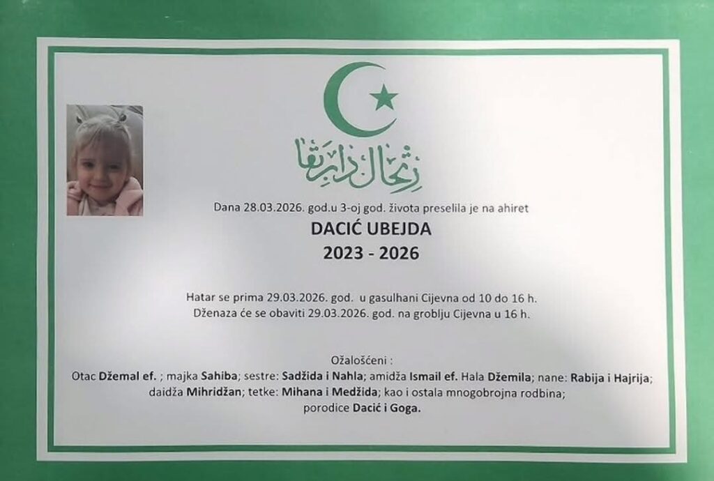 Javnost je potresla vijest o preranoj smrti trogodišnje djevojčice Dacić Ubejde, koja je preselila na ahiret 28. marta 2026. godine, piše 072info.