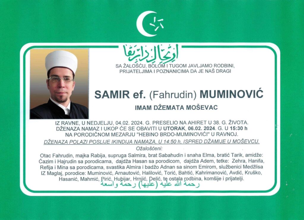 Dženaza r. Samir-ef. Muminoviću, imamu džemata Moševac, obavit će se u utorak, 6.2., u 15:30 sati na mezarju “Hebino brdo-Muminovići” u džematu Ravna.