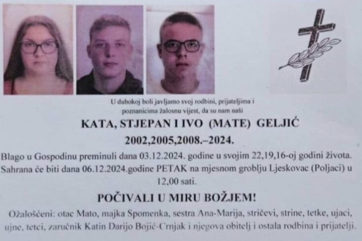 – U dubokoj boli javljamo svoj rodbini, prijateljima i poznanicima žalosnu vijest, da su naši Kata, Stjepan i I. Geljić blago u Gospodinu preminuli dana 3. decembra 2024. godine u svojoj 22, 19 i 16. godini života. Sahrana će biti dana 6. decembra 2024. godine, u petak, na mjesnom groblju Ljeskovac (Poljice) u 12 časova. Počivali u miru Božjem – navodi se u umrlici.