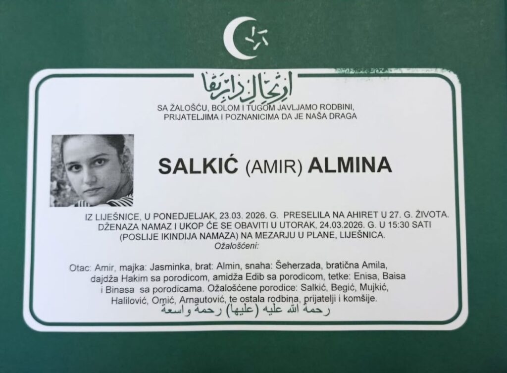 S velikom tugom i boli, porodica, prijatelji i brojni poznanici opraštaju se od Almine Salkić, koja je preselila na Ahiret u ponedjeljak, 23. marta 2026. godine, u 27. godini života.