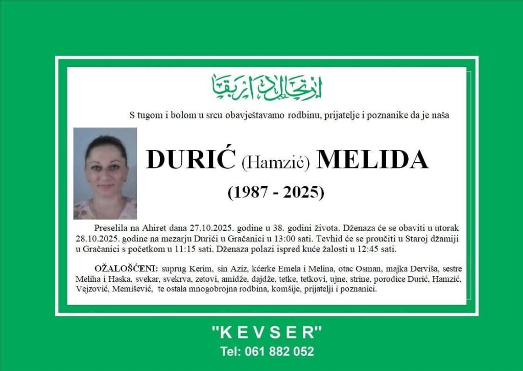 Živinice su zavijene u crno nakon vijesti o smrti Melide Hamzić Durić (1987–2025), majke troje djece i žene koju su svi poznavali po njenoj dobroti, požrtvovanosti i nesebičnosti piše Crna-Hronika.