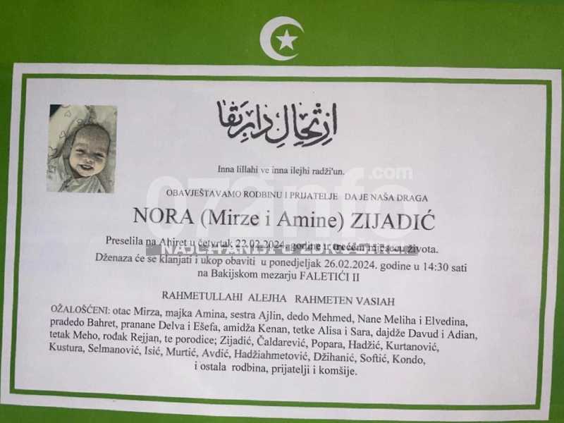 Velika tuga i šok pogodila je Sarajevo nakon vijesti da ih je napustila malena beba Nora Zijadić, piše 072info.