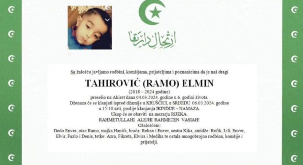Velika tuga pogodila je mjesto Krušćica gdje je preminuo maleni dječak Elmin Tahirović, piše 072info.