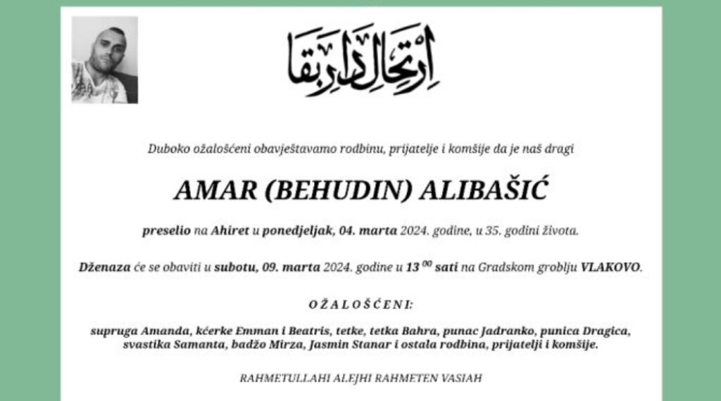 Dženaza namaz bit će obavljena u subotu 09. mart na groblju Vlakovo.