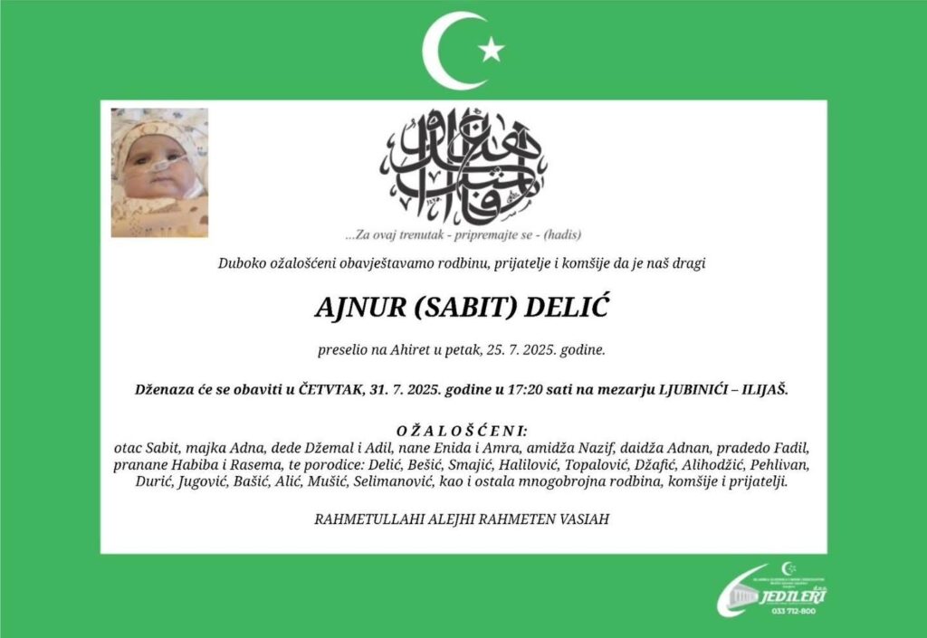 Tužna vijest potresla je porodicu Delić, prijatelje i komšije – mali Ajnur (Sabit) Delić preselio je na Ahiret u petak, 25. jula 2025. godine, piše 072info.