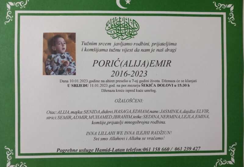 Tužnim srcem i bolom u duši javljamo rodbini, prijateljima i poznanicima da je naš dragi Porić (Alija) Emir dana 10.01.2023. godine u 7-oj godini života, preselio na Ahiret.