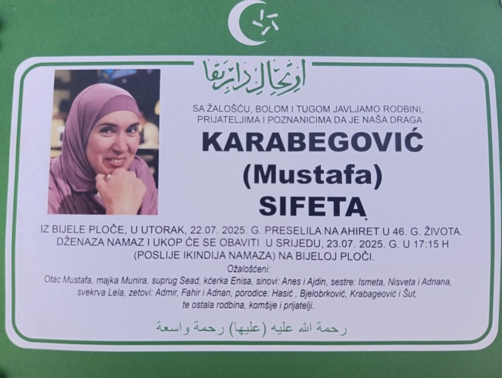 Maglaj je obavijen tugom nakon što je objavljena vijest da je u 46. godini života na Ahiret preselila Sifeta Karabegović, rođena u Bijeloj Ploči, piše 072info.