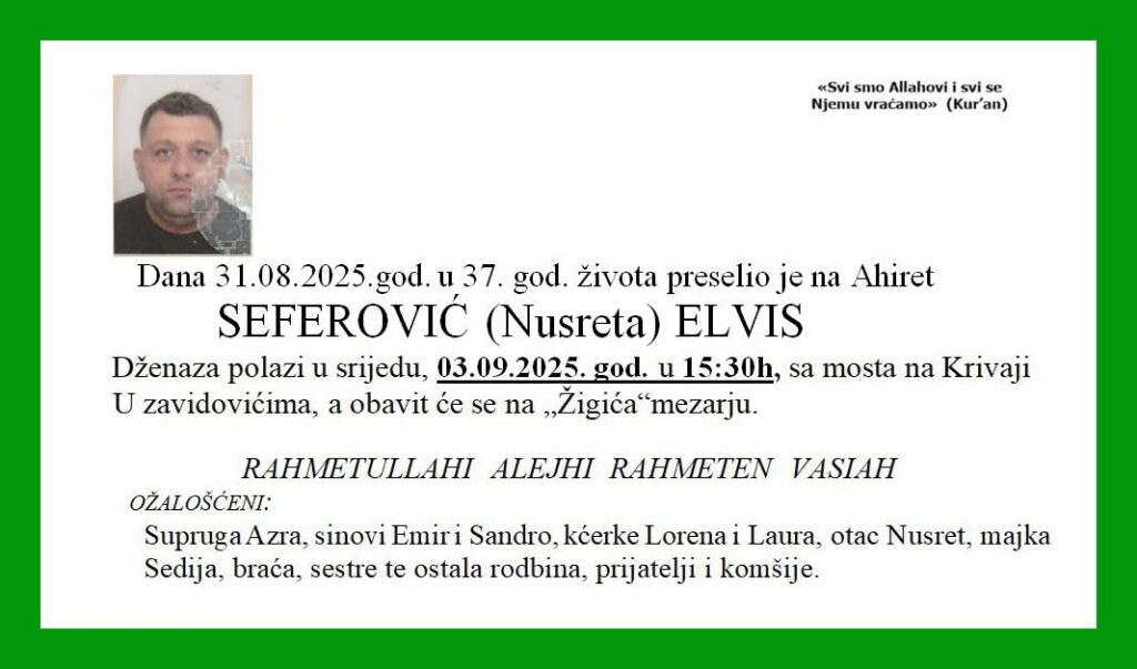 Zavidovići oplakuju prerani odlazak Elvisa Seferovića, rođenog 1989. godine, koji je preminuo 31.08.2025. u 37. godini života, piše 072info.