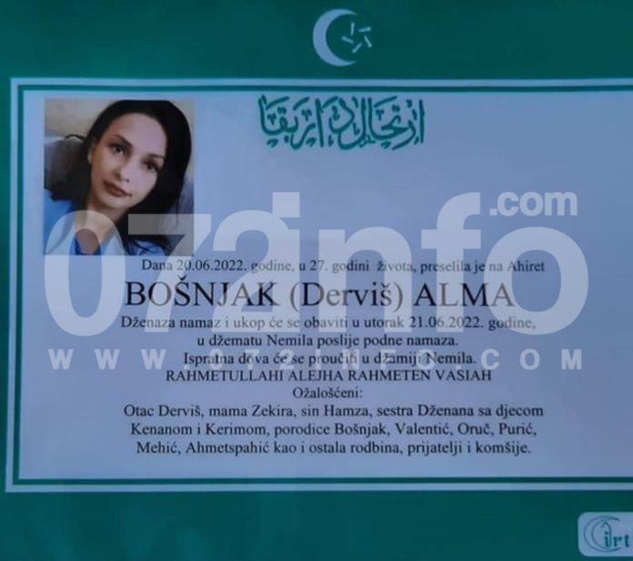 Zenica je obavijena tugom nakon informacije da je preminula mlada Alma Bošnjak, inače medicinska sestra u Kantonalnoj bolnici Zenica, piše 072info.